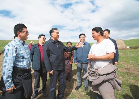 汪洋指出,藏区大多处于高寒边远地区,贫困面大、贫困程度深,脱贫攻坚任务非常艰巨。要加强组织领导,压实工作责任,狠抓政策落实,把已有的脱贫成果巩固好;同时采取更有针对性、实效性的工作,精准施策,精准发力,坚决啃下“硬骨头”。要牢固树立绿水青山就是金山银山的理念,坚持生态惠民、生态利民、生态为民,守好藏区的蓝天、碧水和新鲜空气。(记者林晖 李学仁摄)